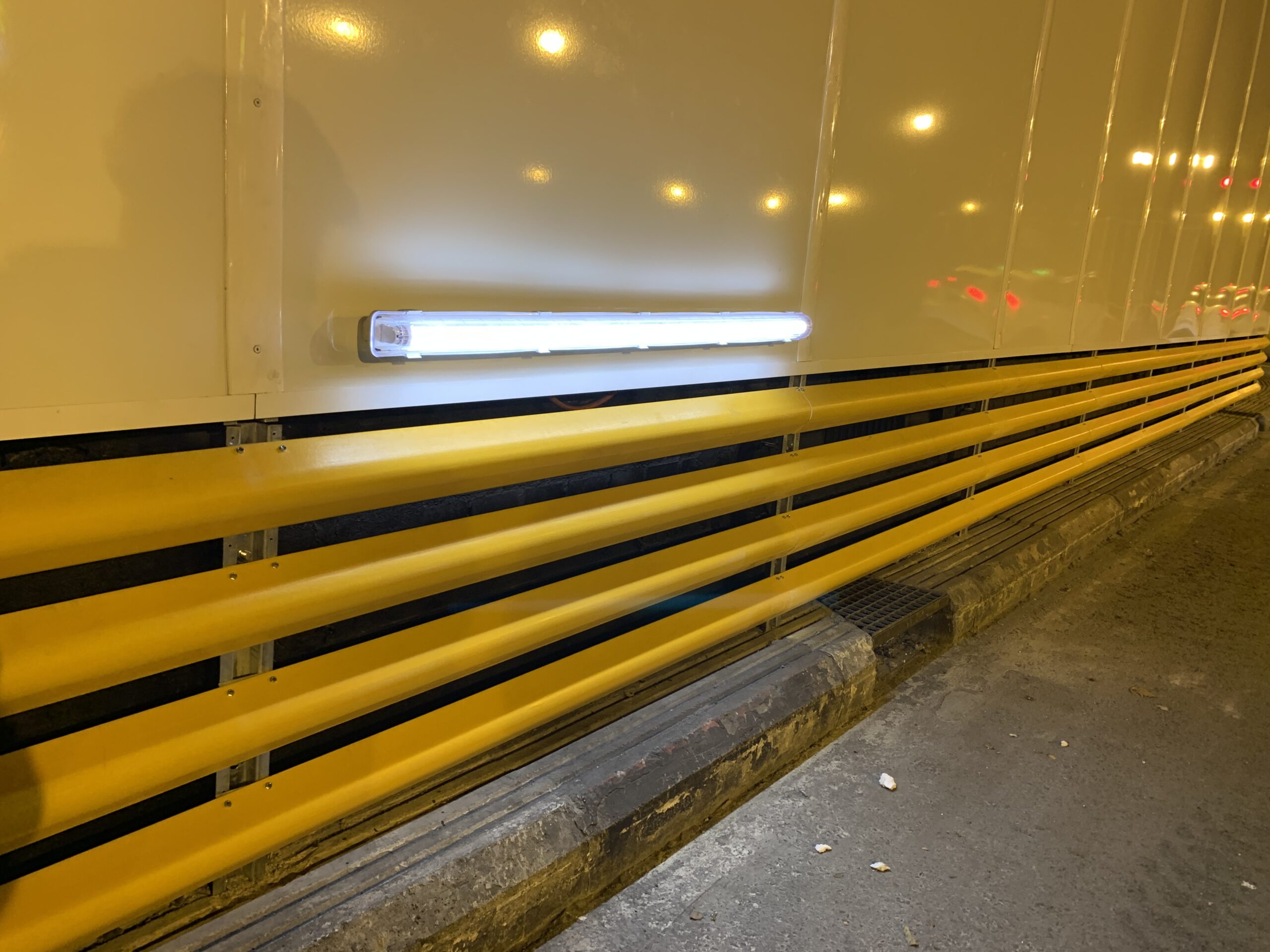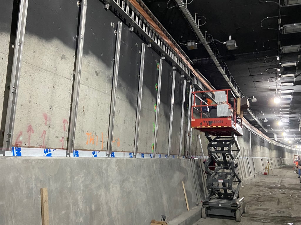 Año 2020 Diseño, suministro e instalación de revestimiento mediante paneles de acero vitrificado con fijaciones ocultas para facilitar la limpieza y mantenimiento de la infraestructura.